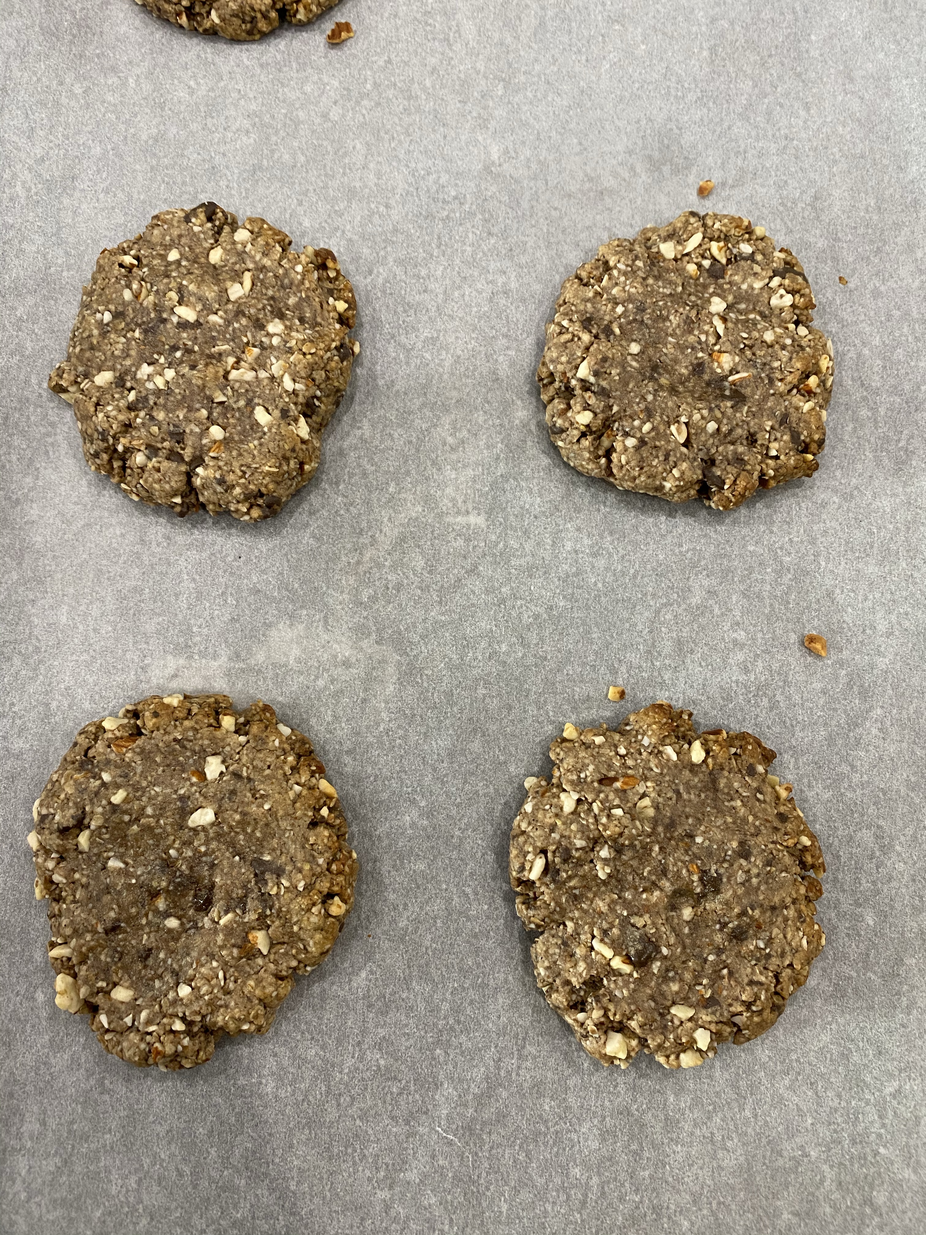 Then put all the ingredients in your blender and mix well. You will have a sticky dough. Make small balls with your hands and place them on your baking tray. Press them down softly.